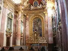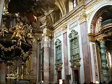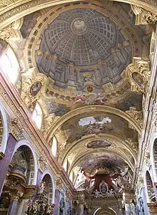 L'intérieur de l'église richement orné contraste avec la façade plus austère. Piliers de faux marbre, colonnes torsadées ou corinthiennes à chapiteaux dorés, angelots dorés, fresques exubérantes, volutes et une grande coupole en trompe-l'œil forment un vocabulaire architectural à la gloire de l'Église triomphante d'après la Contre-Réforme.