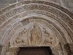 L'église a deux portes : au nord, les restes d'un portique qui abritait la porte romane avec un tympan en arc brisé, encadré par une triple archivolte et décoré d'un bas-relief représentant le Christ Pantocrator entouré du tétramorphe, qui présente encore des traces de polychromie ; au sud, un simple vestibule surélevé qui abrite une porte avec arc en plein cintre.