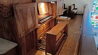 - l’orgue[10]. Le nouvel instrument, réalisé par les ateliers Richard Dot[11], sous la maîtrise d’œuvre de Marc Schaefert, expert organier[12], a été inauguré sous la présidence du Pasteur Véronique Spinder, le 21 octobre 2001, en présence de François Loos, Philippe Richert, Frédéric Reiss et Claude Muckensturn, maire.