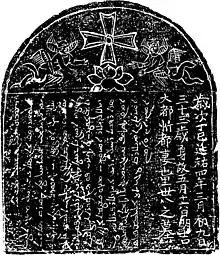 En 781, la communauté chrétienne de Chang'an a érigé une stèle, connue aujourd'hui sous le nom de stèle nestorienne de Xi'an, sur le terrain d'un monastère local. La stèle contient une longue inscription en chinois avec des gloses interlinéaires syriaques, composée par un ecclésiastique du nom d'Adam, probablement le métropolite de Beth Sinaye. L'inscription décrit le développement mouvementé de la mission nestorienne en Chine depuis l'arrivée d'Alopen. L'inscription mentionne également les archidiacres Gigoi de Khumdan [Chang'an], Gabriel de Sarag [Lo-yang], Yazdbuzid, « prêtre et évêque du pays de Khumdan », Sargis, « prêtre et évêque de pays » et l'évêque Yohannan. Ces références confirment que l'Église de l'Orient en Chine avait une hiérarchie bien développée à la fin du VIIIe siècle, avec des évêques dans les deux capitales du nord, et il y avait probablement d'autres diocèses en dehors de Chang'an et Lo-yang.