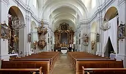 Le seul élément de décoration de l'ancien bâtiment Renaissance qui subsiste aujourd'hui est une peinture du dernier quart du XVIe siècle. L'essentiel de la décoration date de la restructuration de l'église vers 1730, dont notamment maître-autel, les autels secondaires et la chaire à prêcher. Les images du Chemin de Croix présentes sur les deux murs latéraux de la grande nef sont offerts à la paroisse en 1854[2].