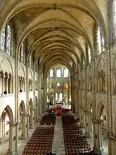 Pour cette phase du chantier, se pose la question de la destinée de l'église primitive, et des conditions de la continuité du culte, car les grandes arcades du nord de l'église gothique réutilisent les fondations du mur gouttereau nord de son prédécesseur. Cette question est d'autant plus inéluctable que le chantier s'interrompt pendant quelques années, entre le lancement de la construction des bas-côtés dans les années 1180 et le départ de travaux de la nef proprement dite vers 1190. Elle a toutefois été éludée par la recherche. Delphine Hanquiez pense cependant pouvoir affirmer que le déambulatoire était accessible aux fidèles, où ils pouvaient vénérer des reliques déposées dans les autels des chapelles rayonnantes[31]. Quoi qu'il en soit, la nef est édifiée entre 1190 et 1200 environ, en commençant au « nord » où la précédente campagne s'était arrêtée, et en avançant toujours par strates horizontales. Avec la minceur extrême de sa structure[32] opposée à l'ampleur du vaisseau central, l'église est une œuvre audacieuse, et l'ajourement du triforium par l'arrière et la quasi-généralisation de la pile composée sont des innovations. Après l'achèvement de l'église seulement, les bâtiments conventuels sont construits jusqu'en 1270 environ, dont le cloître vers 1220/1230. Les bâtiments sont alors occupés par vingt-cinq moines[33],[34], assistés d'une centaine de moines convers[réf. souhaitée].