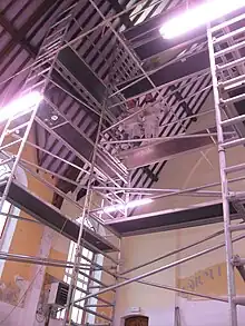 Le chantier a commencé en septembre 2012[66] par le remplacement du gîtage du plancher de l’église. Tous les madriers ont été remplacés par des madriers étuvés sur lesquels les planches anciennes ont ensuite été reclouées. À l'occasion de l'enlèvement de l'ancien gîtage, on a découvert sur le sol de terre, 80 cm plus bas, d'anciens objets laissés sur place par les bâtisseurs de 1876, notamment d'anciennes bouteilles d'eau de Spa.