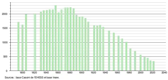 L'évolution du nombre d'habitants est connue à travers les recensements de la population effectués dans la commune depuis 1793. Pour les communes de moins de 10 000 habitants, une enquête de recensement portant sur toute la population est réalisée tous les cinq ans, les populations légales des années intermédiaires étant quant à elles estimées par interpolation ou extrapolation[25]. Pour la commune, le premier recensement exhaustif entrant dans le cadre du nouveau dispositif a été réalisé en 2006[26].