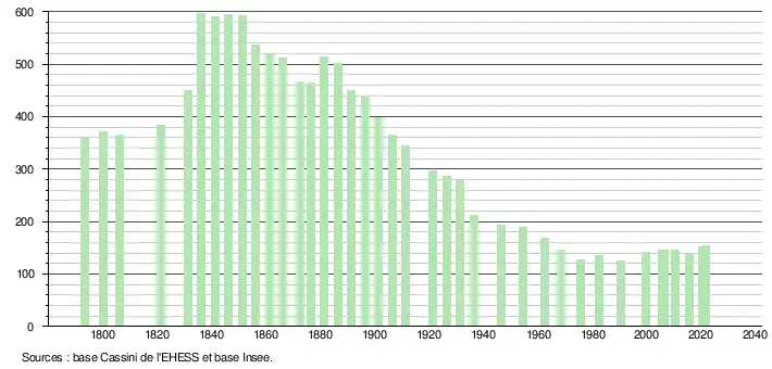 L'évolution du nombre d'habitants est connue à travers les recensements de la population effectués dans la commune depuis 1793. Pour les communes de moins de 10 000 habitants, une enquête de recensement portant sur toute la population est réalisée tous les cinq ans, les populations légales des années intermédiaires étant quant à elles estimées par interpolation ou extrapolation[16]. Pour la commune, le premier recensement exhaustif entrant dans le cadre du nouveau dispositif a été réalisé en 2005[17].