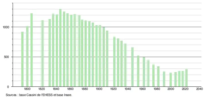 L'évolution du nombre d'habitants est connue à travers les recensements de la population effectués dans la commune depuis 1793. Pour les communes de moins de 10 000 habitants, une enquête de recensement portant sur toute la population est réalisée tous les cinq ans, les populations légales des années intermédiaires étant quant à elles estimées par interpolation ou extrapolation[16]. Pour la commune, le premier recensement exhaustif entrant dans le cadre du nouveau dispositif a été réalisé en 2006[17].