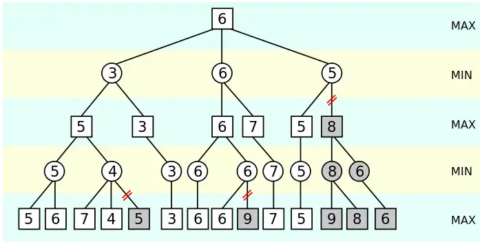 - Le nœud MIN vient de mettre à jour sa valeur courante à 5. Celle-ci, qui ne peut que baisser, est déjà inférieure à α=6, la valeur actuelle du nœud MAX précédent. Celui-ci cherchant la valeur la plus grande possible, ne la choisira donc de toute façon pas.