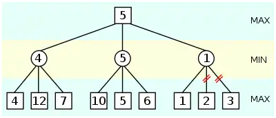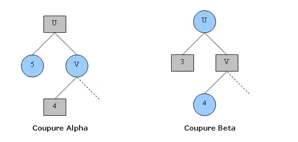 Le schéma ci-dessus présente les deux types de coupures possibles. Les nœuds Min sont représentés par un rond bleu et les nœuds Max par un carré gris. Rappel : les nœuds Min prennent la valeur minimum de leurs enfants (et respectivement maximum pour les nœuds Max).