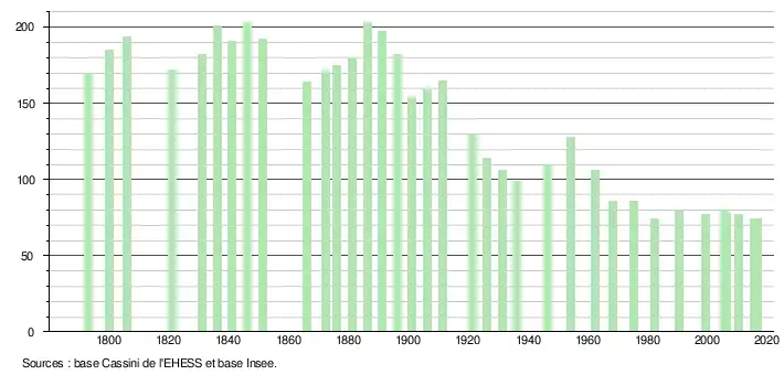 L'évolution du nombre d'habitants est connue à travers les recensements de la population effectués dans la commune depuis 1793. Pour les communes de moins de 10 000 habitants, une enquête de recensement portant sur toute la population est réalisée tous les cinq ans, les populations légales des années intermédiaires étant quant à elles estimées par interpolation ou extrapolation[3]. Pour la commune, le premier recensement exhaustif entrant dans le cadre du nouveau dispositif a été réalisé en 2005[4].