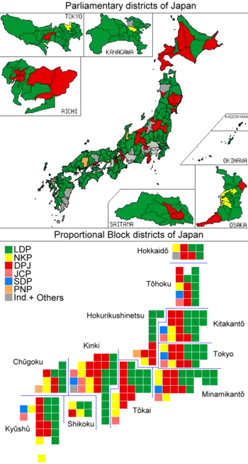 - Sur la région de Kinki, qui correspond surtout à la conurbation Osaka-Kobe-Kyoto, le PDJ disposait avant l'élection de 31 sièges sur 77 (18 sur 48 circonscriptions territoriales, dont 9 des 19 d'Ōsaka et 3 sur 6 à Kyōto, et 13 sur 29 à la proportionnelle), il n'en compte plus désormais que 17 (8 circonscriptions, et notamment plus que 2 à Ōsaka et 9 à la proportionnelle).
