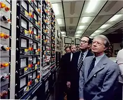 En effet, le , un accident nucléaire se produisit à la centrale nucléaire de Three Mile Island en Pennsylvanie[43]. La centrale avait des défauts de conception, et une série d'erreurs ont conduit à une surchauffe d'un des réacteurs. Le gouverneur de Pennyslvanie Dick Thornburgh, membre du Parti républicain, dut faire évacuer les femmes enceintes et les enfants pendant une dizaine de jours, tandis que le président Carter se rendit sur les lieux quatre jours après l'accident. Cinq jours seront nécessaires pour maîtriser la situation, tandis que le propriétaire de la centrale donna des informations erronées pour rassurer la population, mais en mentant également devant le gouverneur de l'État[43].