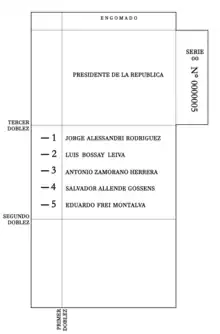 À la fin du mois de juin 1957, le sénateur de Valparaiso Luis Bossay Leiva (es) est choisi pour représenter le Parti radical[2]. Ce parti espérait récupérer la présidence de la République, après l'avoir remporté à trois reprises avant la victoire de Carlos Ibáñez del Campo.