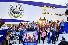 La politique de Bukele lui vaut néanmoins une popularité record malgré ces accusations d'autoritarisme. Après avoir fondé son propre parti présidentiel, Nouvelles Idées, les élections législatives organisées en février 2021 lui permettent d'obtenir finalement une confortable majorité pour mettre en œuvre sa politique. Les élections donnent en effet lieu à une large victoire de Nouvelles Idées, qui réunit la majorité absolue des suffrages et plus de deux tiers des sièges. Cette majorité des deux tiers permet non seulement à sa formation de choisir seule les plus hauts fonctionnaires du gouvernement tels que le Procureur général, mais aussi cinq des quinze membres de la Cour suprême dont le mandat de neuf ans doit prendre fin au cours de la prochaine mandature[6],[7]. Les élections révèlent un profond désaveu de la population envers le système de quasi bipartisme qui voyait l'Assemblée législative dominée depuis la fin de la guerre civile en 1992 par l'Alliance républicaine nationaliste et le Front Farabundo Martí de libération nationale, qui perdent respectivement deux tiers et la quasi-totalité de leur représentation parlementaire[6],[8].