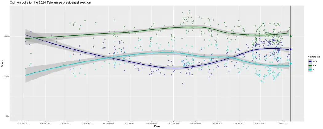 Le vice-président Lai Ching-te, du Parti démocrate progressiste (DPP) bénéficie d'une avance dans les sondages d'opinions tout au long de la campagne, favorisé par la désunion de l'opposition, le Kuomintang (KMT) et le Parti populaire taïwanais (TPP) ayant échoué en novembre à s'entendre sur un duo de candidats communs après plusieurs semaines d'incertitudes. Leurs candidats respectifs, Hou Yu-ih et Ko Wen-je se font ainsi concurrence dans le contexte d'un scrutin à un tour où la désunion de l'opposition avantage le candidat du gouvernement sortant[11],[12],[13],[14].