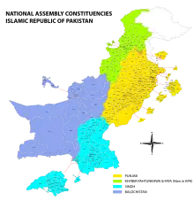 Les sièges à l'Assemblée nationale sont alloués à chaque province, régions tribales sous administration fédérale (FATA) et à la capitale fédérale, en fonction de la population conformément au dernier recensement officiel publié. Les 60 sièges réservés aux femmes et les 10 réservés aux non-musulmans, sont élus par un système de la représentation proportionnelle des partis politiques en fonction du score obtenu à l'Assemblée nationale. Des femmes et des non-musulmans peuvent toutefois se présenter aussi au vote direct.
