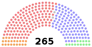 | Total sièges : | 22 | 17 | 17 | 14 | 85 | 75 | 10 | 12 | 4 | 7 | 1 | 1 | 265 | ||