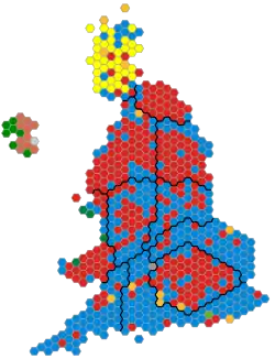 - Note : Ce total n'inclut pas le siège remporté par John Bercow, le président de la Chambre. Bien que ce dernier ne soit plus membre du Parti conservateur, son siège est ajouté au total des conservateurs par certains médias.