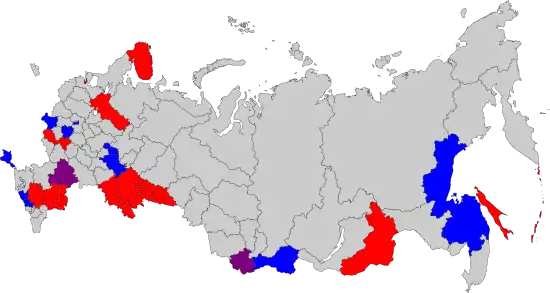 Les trois villes d'importance fédérale russes disposent d'un territoire étendu en dehors des limites urbaines. Les citoyens participent à des élections législatives ainsi qu'à des municipales distinctes. Des élections municipales sont organisées dans 21 autres sujets, dont à Tcheliabinsk où elles ont lieu au scrutin indirect.