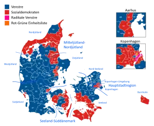 Après dix ans d'un gouvernement de droite soutenu par l'extrême droite, les Danois ont voté pour l'alternance. Le « bloc rouge » constitué de quatre partis de gauche a remporté une courte majorité avec 50,3 % des voix.