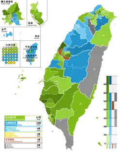 | Kuomintang | 4 723 504 | 33,36 | 13 | 3 | 5 633 749 | 40,57 | 22 | 38 | ||||||