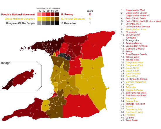Keith Rowley | 39,70 % des voix 12 députés | |