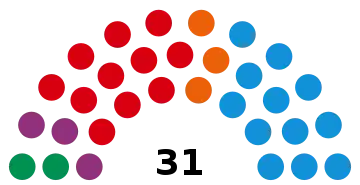 Le nombre de conseillers municipaux est établi en fonction de la population de la commune[5]. Les communes de plus de 100 001 habitants comptent 25 conseillers et un conseiller supplémentaire pour 100 000 habitants ou fraction, ainsi qu'un conseiller supplémentaire si le total de conseillers municipaux constitue un nombre pair. Séville comptant officiellement 696 676 habitants recensés à la fin de l'année , elle dispose de 31 conseillers municipaux.