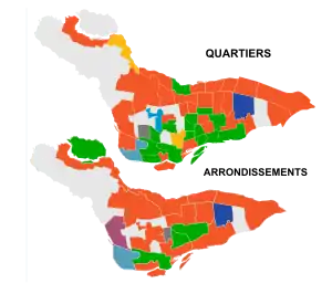 - Ces 38 conseillers, qui ne siègent pas au conseil municipal, sont répartis entre 13 arrondissements, puisque 6 arrondissements (Ahunstic-Cartierville, Côte-des-Neiges–Notre-Dame-de-Grâce, Mercier–Hochelaga-Maisonneuve, Rosemont–La Petite-Patrie, Ville-Marie et Villeray–Saint-Michel–Parc-Extension) n'élisent que des conseillers de ville. Par ailleurs, seuls LaSalle et Verdun élisent deux conseillers d'arrondissements par districts.