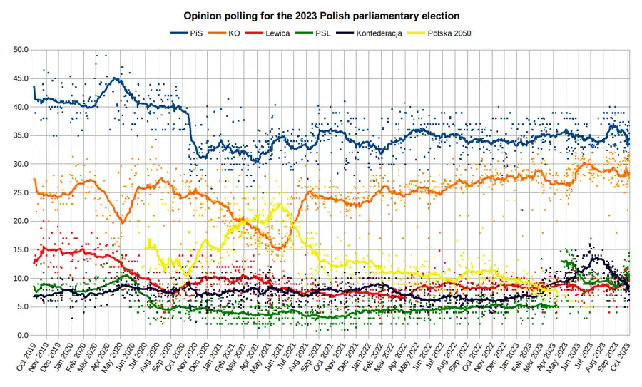Bien qu'en hausse dans les sondages d'opinion par rapport à ses résultats de 2019, l'opposition pâtit néanmoins de l'impopularité de Donald Tusk, qui atteint 60 % de l’opinion publique. Son gouvernement, entre 2007 et 2014, avait été marqué par l’orthodoxie budgétaire, un chômage élevé, les salaires bas et les contrats de travail précaires. L'ancien président du Conseil peine également à se défaire de sa réforme de l’âge de départ à la retraite, effectuée en dépit de ses promesses préélectorales d'alors[14]. Le passage de Donald Tusk à la tête du gouvernement l'avait ainsi vu relever de 65 à 67 ans l'âge de départ à la retraite pour les hommes, et de 60 à 67 ans pour les femmes. La réforme, destinée à s'échelonner jusqu'en 2040, est annulée par Droit et Justice à son arrivée au pouvoir en 2016[15]. Ces antécédents servent en 2023 d'arguments électoraux pour le gouvernement. Ayant au contraire fait campagne avec un programme social sur le thème de la « Pologne solidaire », ce dernier met en exergue le risque d'un retour de ces mesures impopulaires en cas de victoire de la Coalition civique[16],[17],[18]. En 2023, le PiS accuse directement Donald Tusk d'être soumis à des intérêts étrangers, notamment de l'Allemagne, accusée de favoriser son accession au pouvoir pour permettre l'acquisition des biens publics polonais. L'opposition dément vigoureusement ces accusations, accusant en retour le gouvernement de faire du népotisme en récompensant ses alliés par l'attribution de postes à haute rémunération dans les directions de ces entreprises publiques[19],[20].
