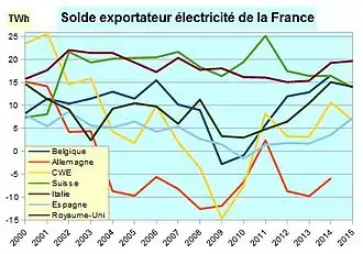 La France est en 2023 le premier pays exportateur d’Europe, par son solde exportateur de 50,1 TWh. En 2019, elle était le premier pays exportateur au monde, effectuant 17,3 % des exportations mondiales mais avait perdu cette place en 2022, devenant importatrice nette (solde importateur : 16,5 TWh).