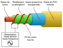 Enfin, l'électroluminescence a été adaptée sous forme de fibre ou de câble électroluminescent se composant d'un noyau de cuivre recouvert de "phosphore (en)", d'un fil très fin enroulé en spirale puis de deux gaines transparentes en PVC.