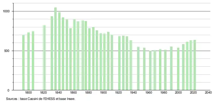 L'évolution du nombre d'habitants est connue à travers les recensements de la population effectués dans la commune depuis 1793. Pour les communes de moins de 10 000 habitants, une enquête de recensement portant sur toute la population est réalisée tous les cinq ans, les populations légales des années intermédiaires étant quant à elles estimées par interpolation ou extrapolation[25]. Pour la commune, le premier recensement exhaustif entrant dans le cadre du nouveau dispositif a été réalisé en 2006[26].