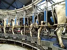 - 3,3 millions de vaches laitières, principalement Prim'Holstein réparties dans 92 000 exploitations soit en moyenne 40 à 50 vaches par exploitation laitière (avec un maximum de 150). La France est ainsi le deuxième pays producteur de lait en Europe après l’Allemagne. Environ 70 % des veaux nés en filière laitière (vêlage nécessaire pour déclencher la lactation) sont destinés à la boucherie (viande de veau), tandis que 30 % vont au renouvellement de vaches laitières. Lorsque les vaches laitières ne donnent plus assez de lait, les vaches de réforme finissent leur carrière à l’abattoir pour production de viande. Près de la moitié (40 %) de la viande bovine en France provient de la filière laitière (vaches de réforme + jeunes bovins)[5],[6].