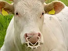 L'enregistrement d'un animal est attesté par les boucles sur chaque oreille portant ses numéros d'immatriculation.