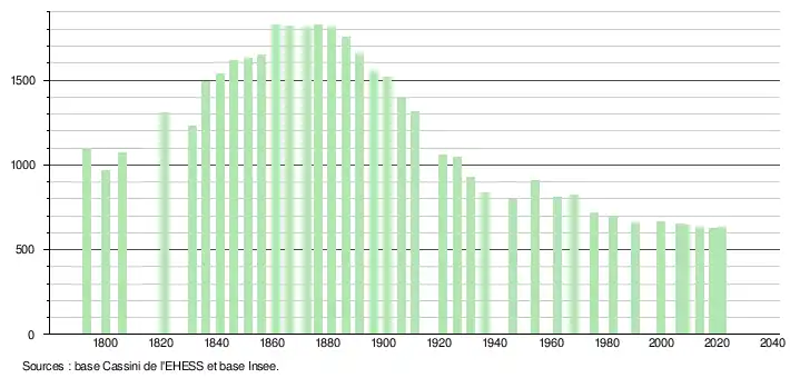L'évolution du nombre d'habitants est connue à travers les recensements de la population effectués dans la commune depuis 1793. Pour les communes de moins de 10 000 habitants, une enquête de recensement portant sur toute la population est réalisée tous les cinq ans, les populations légales des années intermédiaires étant quant à elles estimées par interpolation ou extrapolation[20]. Pour la commune, le premier recensement exhaustif entrant dans le cadre du nouveau dispositif a été réalisé en 2008[21].
