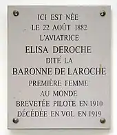 Élisa Deroche[1], connue sous le pseudonyme de baronne Raymonde de Laroche, est une actrice et aviatrice française née le à Paris (4e arr.)[2] et morte le dans un accident d'avion au Crotoy. C'est la première femme au monde à avoir obtenu son brevet de pilote-aviatrice le , faisant date dans l'histoire de l'aviation féminine, avec Thérèse Peltier, Marthe Niel et Amelia Earhart.