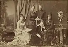 De droite à gauche, l'archiduchesse Élisabeth, l'archiduchesse Marie-Thérèse (future reine de Bavière), l'archiduchesse Marie-Christine (reine d'Espagne), à l'arrière, son fils, l'archiduc Charles Étienne et son épouse, née princesse Isabelle de Croÿ-Dülmen