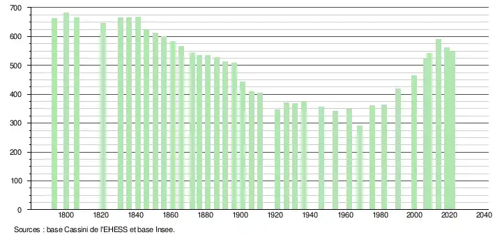 L'évolution du nombre d'habitants est connue à travers les recensements de la population effectués dans la commune depuis 1793. Pour les communes de moins de 10 000 habitants, une enquête de recensement portant sur toute la population est réalisée tous les cinq ans, les populations légales des années intermédiaires étant quant à elles estimées par interpolation ou extrapolation[18]. Pour la commune, le premier recensement exhaustif entrant dans le cadre du nouveau dispositif a été réalisé en 2008[19].