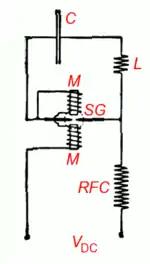 Cette deuxième méthode à onde unique est appelée la "méthode d'absorption", et elle implique deux circuits accordés et un un manipulateur à fermeture avant rupture SPDT. Lorsque le manipulateur est abaissé, l'arc est connecté à la bobine d'accord de l'antenne et à l'antenne. Lorsque le manipulateur est en position haute, l'arc est connecté à une antenne fictive (en) accordée appelée "shunt arrière". Le shunt arrière était un second circuit accordé consistant en une inductance, un condensateur et une résistance de charge en série[11],[12]. Ce second circuit est accordé à peu près à la même fréquence que la fréquence transmise ; il maintient l'arc en fonctionnement et absorbe la puissance de l'émetteur. L'invention de la méthode d'absorption est apparemment due à W. A. Eaton[3].