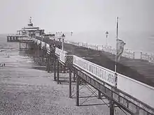 - Pier de Blankenberge (Zeedijk, 1894) : première jetée bombardée pendant la Grande Guerre (1915). Au-delà d’une place en demi-cercle qui devait initialement accueillir une piscine d’eau de mer, cette promenade en mer déroulait son large plancher de bois sur pilotis en fonte sur 350 mètres de long, une structure étudiée par l’ingénieur Erich Wyhowski. Bordé de rambardes en fer forgé, entrecoupées d’alcôves offrant des bancs aux promeneurs et d’une placette intermédiaire garnie d’un kiosque, il s’élargissait en large musoir octogonal. L’accès au pavillon en rotonde, coiffé d’un petit dôme, était payant comme en témoignent les guichets placés en amont. Il abritait une salle des fêtes, un café-restaurant, des caves à vin et à bière et une galerie pour pêcheurs. Le Pier connaît un succès immédiat dès son inauguration (180.000 visiteurs, 1894)[5]. - Bains de la Ville de Bruxelles (1903);
