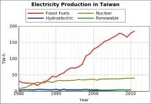 La production d'électricité de Taiwan était de 290,9 TWh en 2021, dont 128,9 TWh produits par les centrales au charbon (44,3 %), 108,3 TWh par les centrales au gaz (37,2 %), 5,3 TWh à partir de pétrole (1,8 %) et 27,8 TWh par les centrales nucléaires (9,6 %). Les énergies renouvelables ont produit 18,8 TWh, soit 6,5 % du total (hydro : 6,7 TWh, solaire : 8 TWh, éolien : 2,2 TWh, déchets : 1,8 TWh)[7].