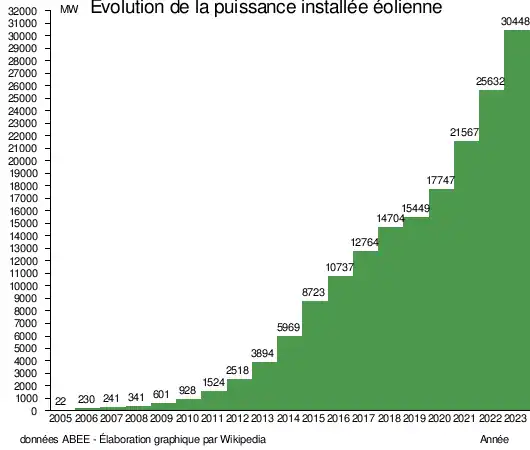 Le parc éolien du Brésil atteint 30 449 MW de puissance installée en 2023, soit 3,0 % du total mondial, au 6e rang mondial, derrière la Chine (43,5 %), les États-Unis (14,7 %), l'Allemagne (6,8 %), l'Inde (4,4 %) et l'Espagne (3,0 %). Les nouvelles installations d'éoliennes au Brésil en 2023 se sont élevées à 4 817 MW, soit 4,1 % du marché mondial, au 3e rang mondial, derrière la Chine (65 %) et les États-Unis (5,5 %)[13].