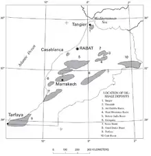 Selon le Conseil mondial de l'énergie, les réserves prouvées de pétrole de schiste au Maroc étaient estimées en 2013 à 53 Gbl (milliards de barils)[5]. Les principaux gisements sont situés à Timahdit dans le Moyen Atlas et Tarfaya dans le sud[6]. Un premier gisement avait été découvert à Tanger dans les années 1930, et les grands gisements de Timahdit et Tarfaya ont été découvertes à la fin des années 1960 ; ils ont été étudiés de façon approfondie ; les réserves suffiraient à couvrir les besoins du Maroc pendant 800 ans. L'ascension des prix pétroliers pendant les années 1980 et 1990 a amené des compagnies européennes et nord-américaines à explorer ces gisements et à expérimenter leur exploitation ; plus de 2 200 tonnes de schistes bitumineux de Timahdit et Tarfaya ont été traités dans des usines pilotes aux États-Unis, en Europe, au Canada et au Japon. Une usine pilote a été construite au Maroc et a traité 2 500 tonnes de schistes bitumineux de Timahdit de 1983 à 1986, et des études ont été menées pour bâtir des usines de 50 000 bl/j (barils par jour) à Timahdit et Tarfaya, mais la chute des prix pétroliers au milieu des années 1980 a stoppé ces projets. L'intérêt pour ces projets est revenu avec la hausse des prix des années 2000 ; l'Office National des Hydrocarbures et des Mines (ONHYM) a conclu en 2009 un accord avec Petrobras et Total pour explorer Timahdit et Tarfaya et un autre avec San Leon Energy Plc pour tester la fracturation hydraulique à Tarfaya[7].