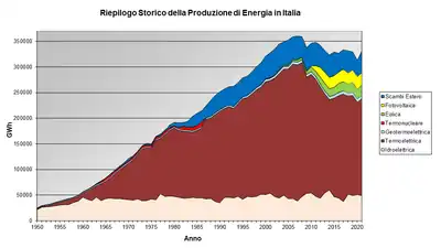 L'Italie bénéficie d'un potentiel hydroélectrique important, en particulier dans les Alpes, mais il est déjà presque entièrement exploité ; la première centrale hydroélectrique entre en service à Tivoli, près de Rome, en 1892[6] et pendant la première moitié du XXe siècle, l'hydroélectricité couvrait la quasi-totalité des besoins d'électricité du pays.