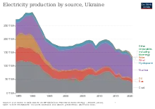 La plus grande centrale nucléaire d'Europe, la centrale nucléaire de Zaporizhzhia, est située en Ukraine. En 2012, le gouvernement prévoyait de construire 5 à 7 GW de nouveaux réacteurs d'ici 2030[6]. Les énergies renouvelables jouent encore un rôle très modeste dans la production électrique : en 2019, la production d'électricité était assurée par le nucléaire (54 %), le thermique fossile (37 %, dont charbon 29 % et gaz 8 %), l'énergie hydroélectrique (5 %), le solaire (2 %) et l'éolien (1 %)[6].