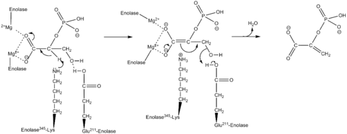 En utilisant des sondes isotopiques, le mécanisme complet pour la conversion du 2-PG en PEP est une réaction d'élimination du type E1cb impliquant un intermédiaire carbanion[7]. Le mécanisme détaillé qui suit est basé sur des études cristallographie et de cinétique chimique[3],[8],[9],[10],[11],[12],[13]. Quand le substrat, le 2-phosphoglycérate, se lie à l'α-énolase, son groupe carboxyle forme une liaison de coordination avec les deux ions magnésium dans le site actif. Ceci stabilise la charge négative de l'oxygène déprotoné tout en augmentant l'acidité de l'hydrogène alpha. La Lys345 de l'énolase déprotone l'hydrogène alpha et la charge négative résultante est stabilisée sur l'oxygène du carboxylate par la résonance de l'ion cofacteur magnésium. Après la formation de l'intermédiaire carbanion, l'hydroxyde en C3 est éliminé avec l'eau grâce au Glu211, et le PEP est ainsi formé.