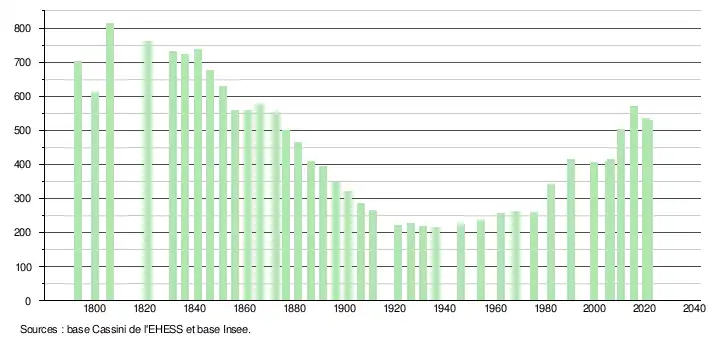 L'évolution du nombre d'habitants est connue à travers les recensements de la population effectués dans la commune depuis 1793. Pour les communes de moins de 10 000 habitants, une enquête de recensement portant sur toute la population est réalisée tous les cinq ans, les populations légales des années intermédiaires étant quant à elles estimées par interpolation ou extrapolation[20]. Pour la commune, le premier recensement exhaustif entrant dans le cadre du nouveau dispositif a été réalisé en 2005[21].