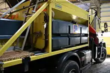 - épandeuse tractée : l'outil est équipé de roues et est remorqué par le camion porteur ;