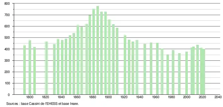 L'évolution du nombre d'habitants est connue à travers les recensements de la population effectués dans la commune depuis 1793. Pour les communes de moins de 10 000 habitants, une enquête de recensement portant sur toute la population est réalisée tous les cinq ans, les populations légales des années intermédiaires étant quant à elles estimées par interpolation ou extrapolation[40]. Pour la commune, le premier recensement exhaustif entrant dans le cadre du nouveau dispositif a été réalisé en 2008[41].