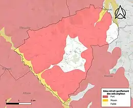 Le retrait-gonflement des sols argileux est susceptible d'engendrer des dommages importants aux bâtiments en cas d’alternance de périodes de sécheresse et de pluie. 83,3 % de la superficie communale est en aléa moyen ou fort (67,4 % au niveau départemental et 48,5 % au niveau national). Sur les 156 bâtiments dénombrés sur la commune en 2019, 78 sont en aléa moyen ou fort, soit 50 %, à comparer aux 81 % au niveau départemental et 54 % au niveau national. Une cartographie de l'exposition du territoire national au retrait gonflement des sols argileux est disponible sur le site du BRGM[25],[Carte 3].