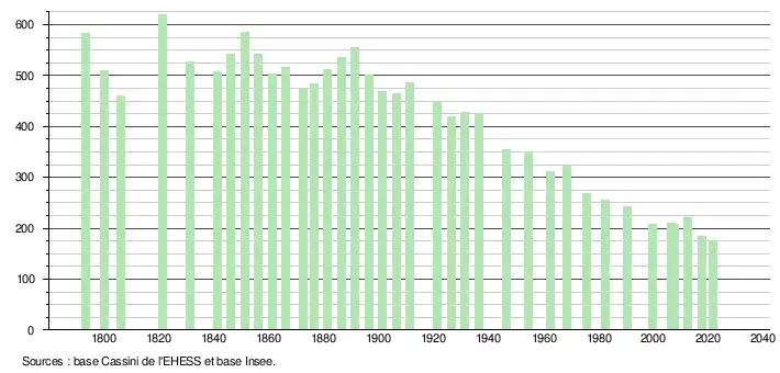 L'évolution du nombre d'habitants est connue à travers les recensements de la population effectués dans la commune depuis 1793. Pour les communes de moins de 10 000 habitants, une enquête de recensement portant sur toute la population est réalisée tous les cinq ans, les populations légales des années intermédiaires étant quant à elles estimées par interpolation ou extrapolation[33]. Pour la commune, le premier recensement exhaustif entrant dans le cadre du nouveau dispositif a été réalisé en 2007[34].